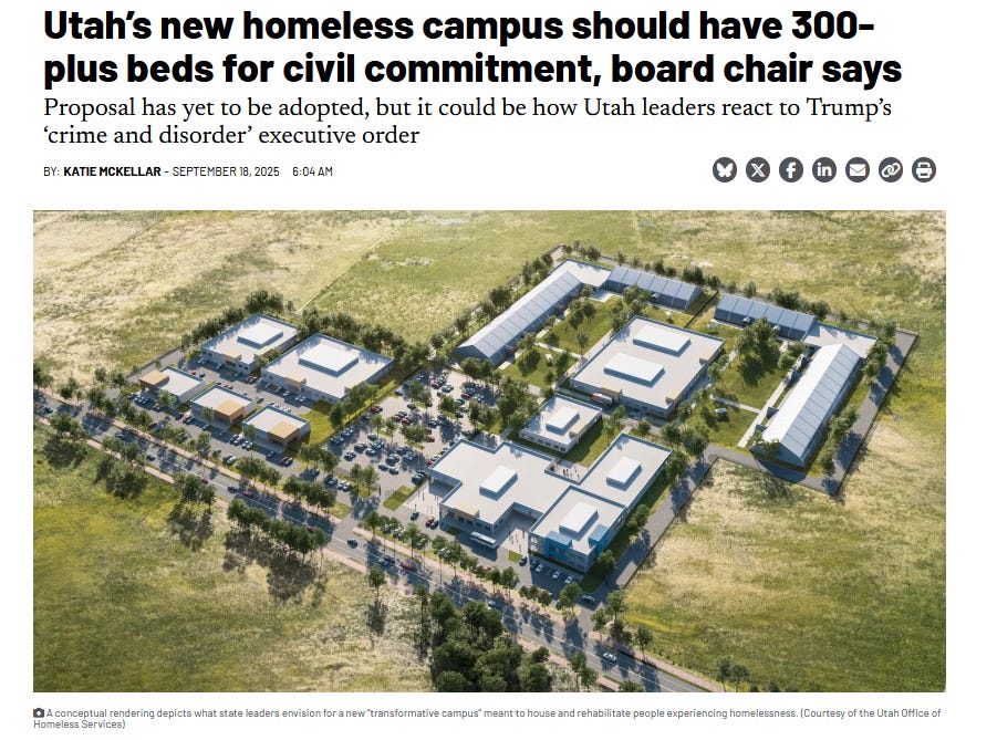 A plan is rapidly gathering political support in Utah for a sprawling, gated, guarded detention area for unhoused people in the remote desert. According to news reports, (see stories here and here), this so-called homeless “campus” would hold 1,300 or more people, and include a huge on-site civil commitment facility, dubbed by its promoters as an “accountability center” for misbehaving homeless people to get, they say, “healing.”