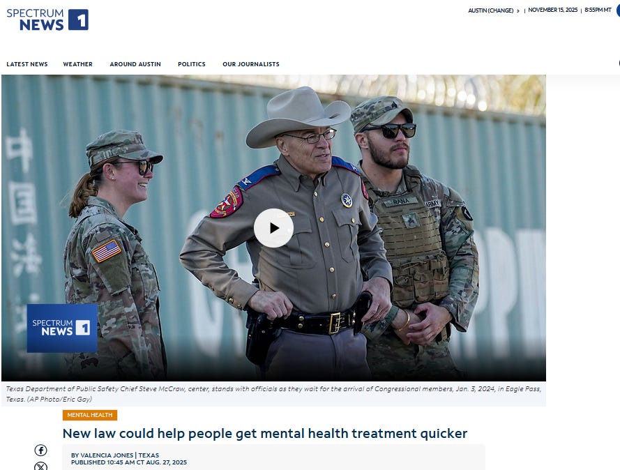 According to this report from Spectrum News 1, a statute passed earlier this year in Texas “will allow law enforcement officers to detain without a warrant those who they believe are at risk of harming themselves or others due to mental illness.”