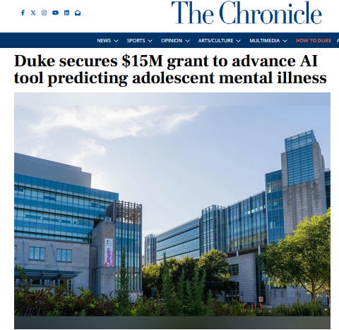 According to a number of articles (e.g. here and here), a team of Duke University researchers have developed an AI tool that can predict, with “84% accuracy” which adolescents are “most likely to develop a mental illness within a year”—which helped the researchers pull in a $15 million grant to scale their work into real-time tracking of thousands of young people.