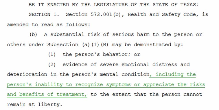 Yes. And it does much more than that... In fact, Texas Senate Bill 1164 introduces a whole new criterion under which someone can be detained by police and involuntarily committed by physicians to a psychiatric hospital. In doing so, it made the state’s civil commitment statutes some of the most broad and aggressive in the country.